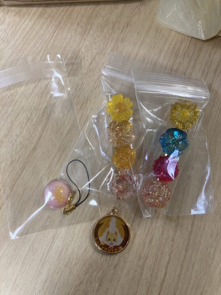 ↑手作りのグッズは、約300円から500円で販売する予定。 キーホルダーには並木から拾ってきたいちょうを使用している(写真右)