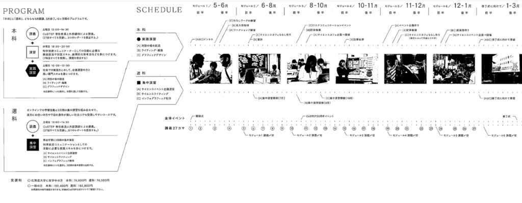 これらの講義ではAR[1]やSNS動画といった多岐にわたる発信方法や、伝えたいもののコンセプトを上手く可視化し表現するグラフィックデザインなど、科学技術コミュニケーションにとどまらない重要なスキルを身に着けることができる。その講義で身につけたスキルをサイエンスカフェ札幌などのCoSTEPのイベントの企画、開催を通して実践する。