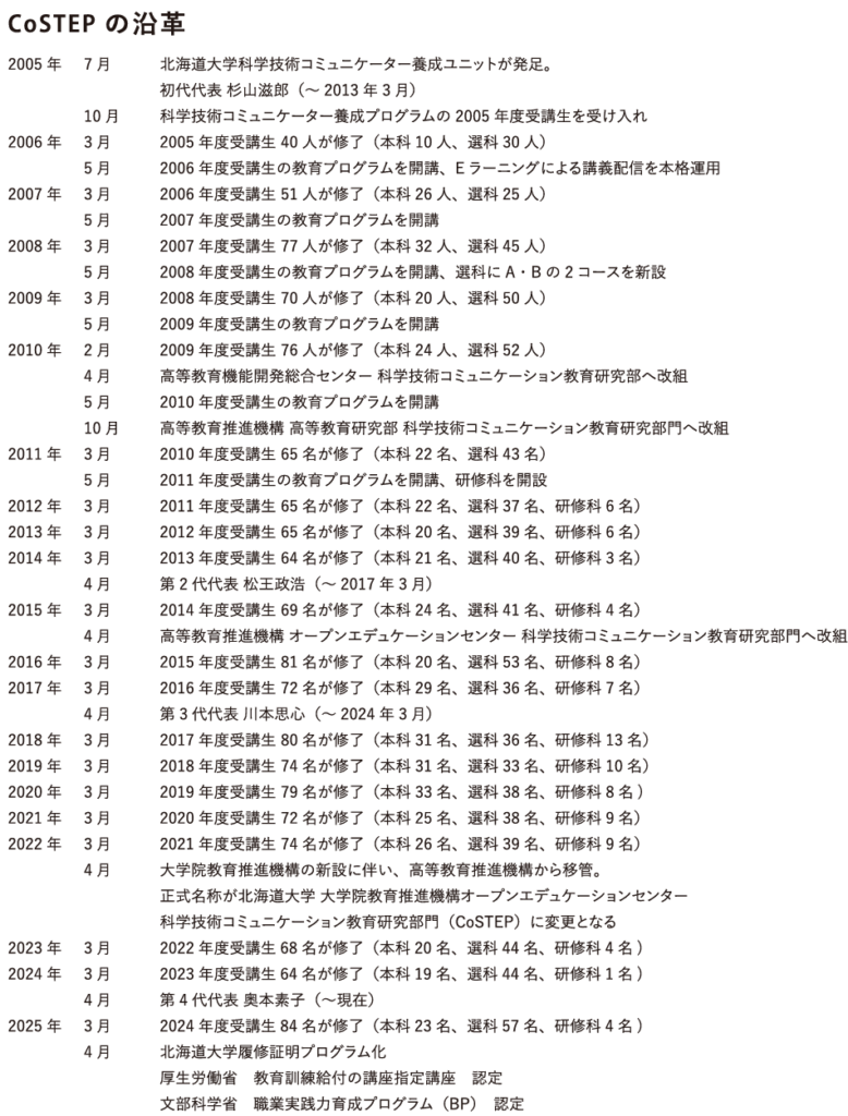 北大の科学技術コミュニケーション部門であるCoSTEP(Communication in Science & Technology Education & Research Program;コーステップ)は2005年の開講から今年で20周年を迎える。大学院生を中心に社会人から主婦まで、幅広い受講生を抱えるこの講座は国内で最大かつ最古の科学技術コミュニケーションプログラムとして20年間常に最先端であり続けた。
