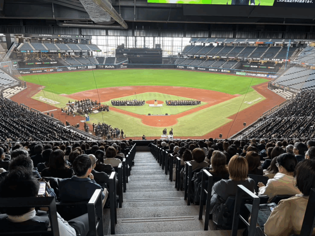総合入試理系で入学した新入生は、「エスコンには初めて足を運んだが、広くてとても楽しかった。これからの大学生活が楽しみでいっぱい」と笑顔で語った。